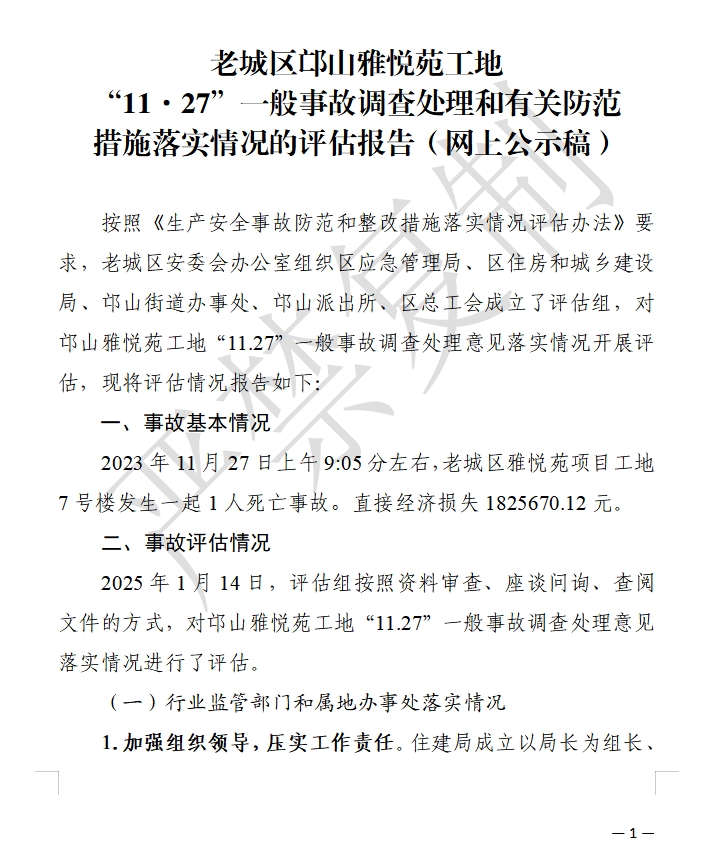 老城区邙山雅悦苑工地“11·27”一般事故调查处理和有关防范措施落实情况的评估报告
